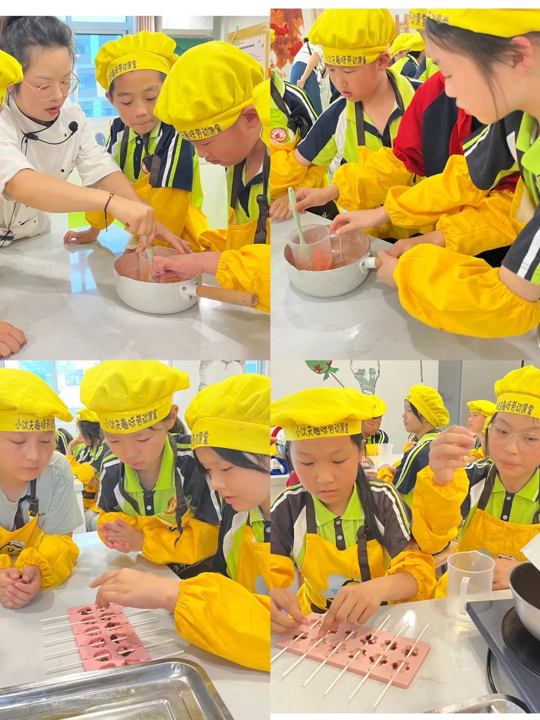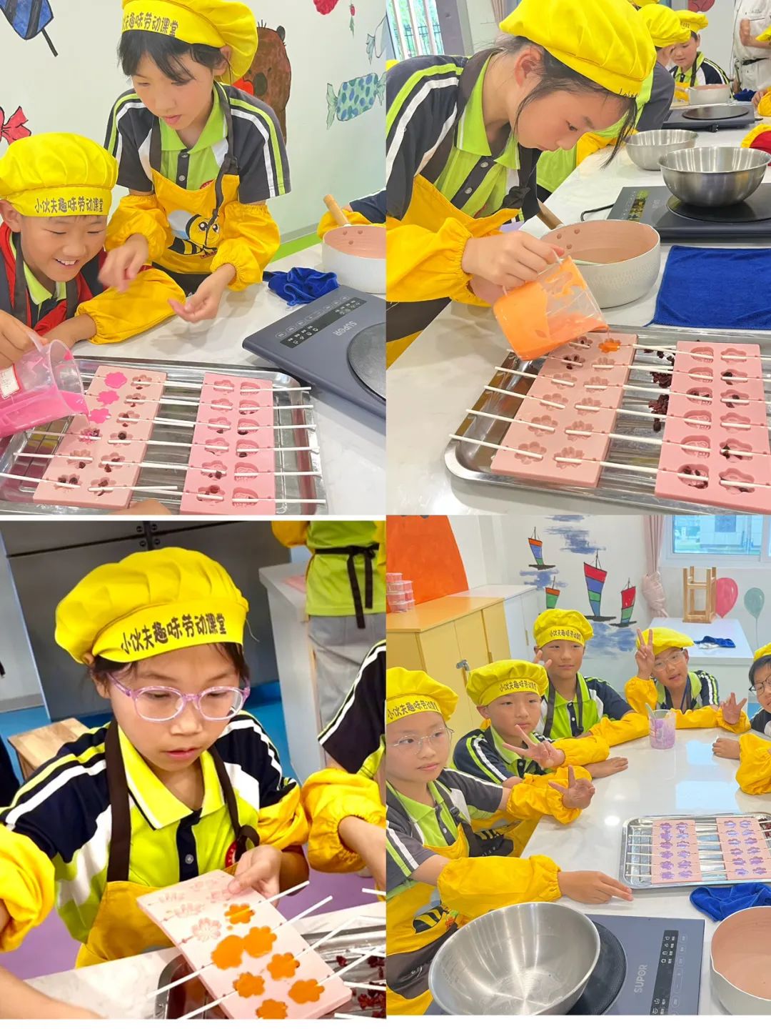 终于到了最令人期待的环节 —— 填充模具!学生们小心翼翼地将调好的巧克力糖浆倒入可爱的模具中,小熊、星星、爱心等造型的模具,在糖浆的注入下仿佛被赋予了生命。灌模完成后,静静地等待棒棒糖冷却成型。这等待的时间里,同学们兴奋地交流着自己对棒棒糖的期待,分享着制作过程中的有趣瞬间,欢声笑语回荡在整个工坊。